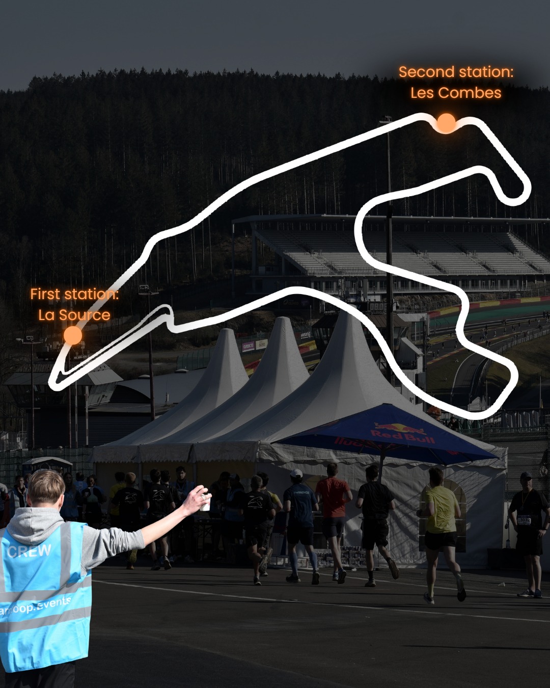 Maak je klaar voor een onvergetelijke run op het legendarische Circuit de Spa-Francorchamps! Langs het parcours staan twee goed uitgeruste verzorgingsposten klaar om jou een extra boost te geven wanneer jij die het hardst nodig hebt.